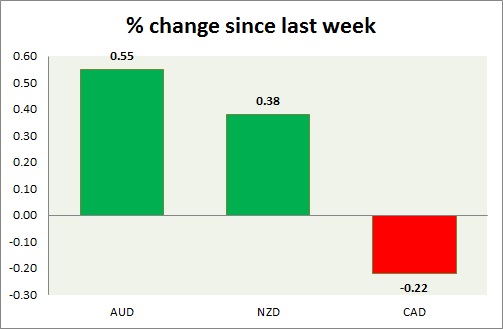 Strength meter (since last week) – Aussie +0.55%, Kiwi +0.38%, Loonie -0.22%