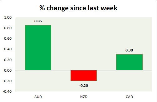 Strength meter (since last week) – Aussie +0.85%, Kiwi -0.20%, Loonie +0.30%