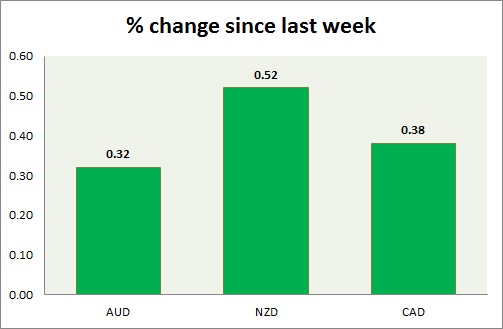 Strength meter (since last week) – Aussie +0.32%, Kiwi +0.52%, Loonie +0.38%