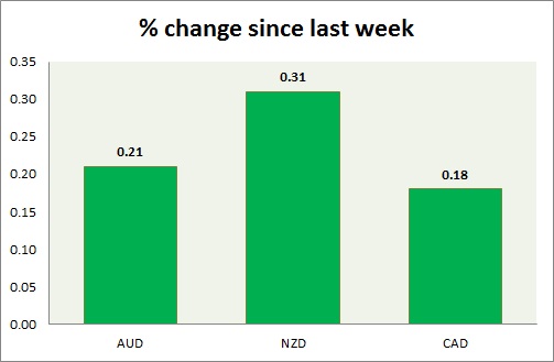 Strength meter (since last week) – Aussie +0.21%, Kiwi +0.31%, Loonie +0.18%