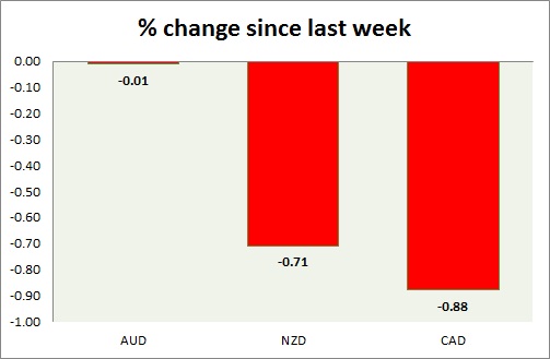 Strength meter (since last week) – Aussie -0.01%, Kiwi -0.71%, Loonie -0.88%