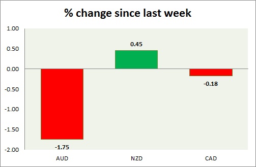 Strength meter (since last week) – Aussie -1.75%, Kiwi +0.45%, Loonie -0.18%
