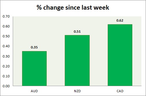 Strength meter (since last week) – Aussie +0.35%, Kiwi +0.51%, Loonie +0.62%