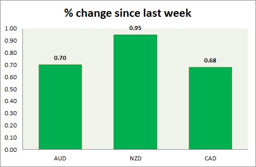 Strength meter (since last week) – Aussie +0.70%, Kiwi +0.95%, Loonie +0.68%