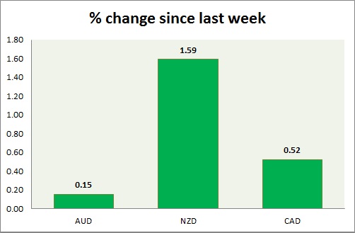 Strength meter (since last week) – Aussie +0.15%, Kiwi +1.59%, Loonie +0.52%