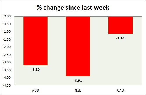 Strength meter (since last week) - Aussie -3.19%, Kiwi -3.91%, Loonie -1.14%.