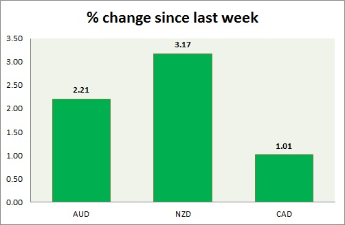 Strength meter (since last week) - Aussie +2.21%, Kiwi +3.17%, Loonie +1.01%.