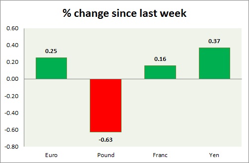 Strength meter (since last week) - Euro +0.25%, Franc +0.16%, Yen +0.37%, GBP -0.63%