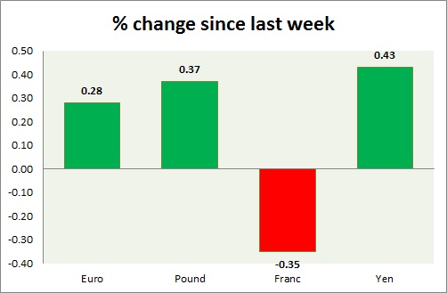 Strength meter (since last week) - Euro +0.28%, Franc -0.35%, Yen +0.43%, GBP +0.37