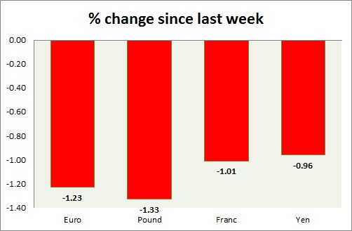 Strength meter (since last week) - Euro -1.23%, Franc -1.01%, Yen -0.96%, GBP -1.33%