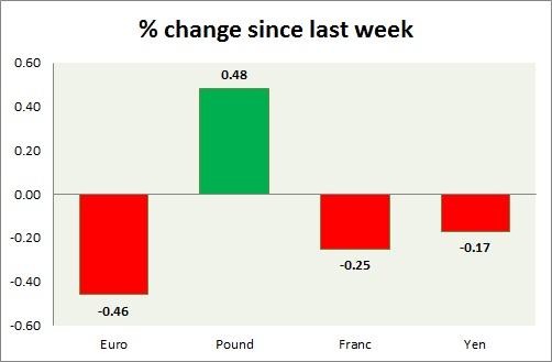 Strength meter (since last week) - Euro -0.46%, Franc -0.25%, Yen -0.17%, GBP +0.48%