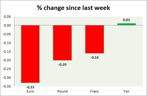 Strength meter (since last week) - Euro -0.33%, Franc -0.16%, Yen +0.01%, GBP -0.20%
