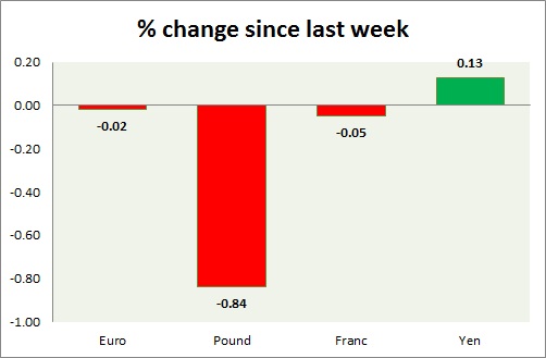Strength meter (since last week) - Euro -0.02%, Franc -0.05%, Yen +0.13%, GBP -0.84%
