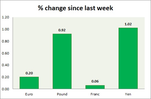 Strength meter (since last week) – Euro +0.20%, Franc +0.06%, Yen +1.02%, GBP +0.92%