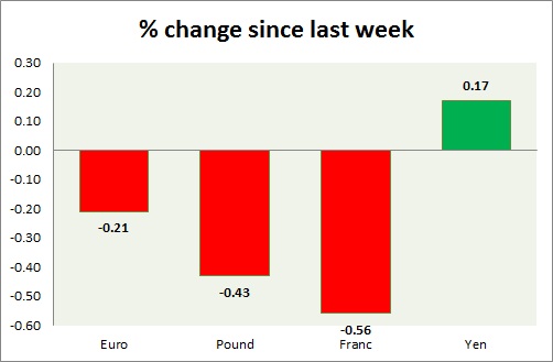 Strength meter (since last week) - Euro -0.21%, Franc -0.56%, Yen +0.17%, GBP -0.43%