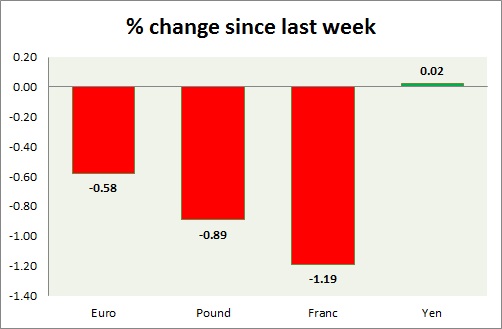 Strength meter (since last week) - Euro -0.58%, Franc -1.19%, Yen +0.02%, GBP -0.89%