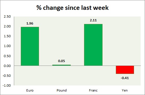 Strength meter (since last week) - Euro +1.96%, Franc +2.11%, Yen -0.41%, GBP +0.05%