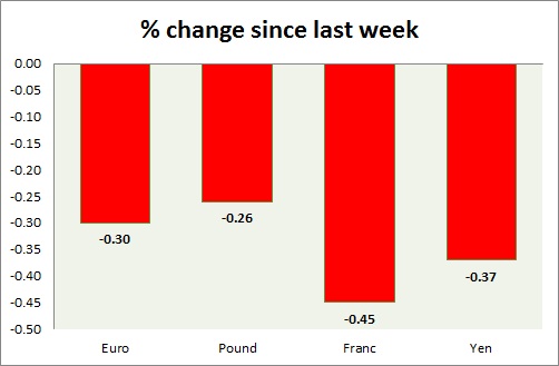 Strength meter (since last week) - Euro -0.30%, Franc -0.45%, Yen -0.37%, GBP -0.26%
