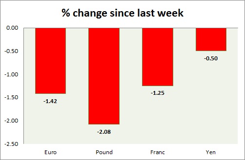 Strength meter (since last week) - Euro -1.42%, Franc -1.25%, Yen -0.50%, GBP -2.08%
