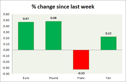 Strength meter (since last week) - Euro +0.47%, Franc -0.33%, Yen +0.22%, GBP +0.48%