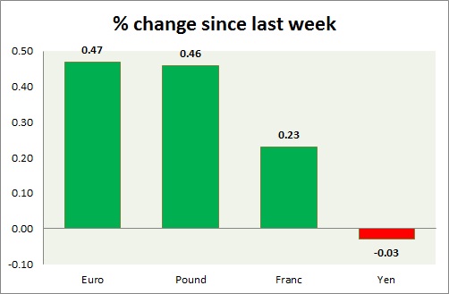 Strength meter (since last week) - Euro +0.47%, Franc +0.23%, Yen -0.03%, GBP +0.46%