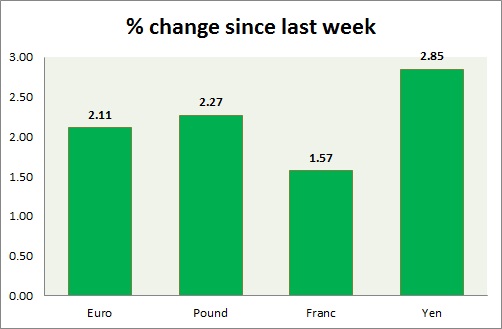 Strength meter (since last week) - Euro +0.87%, Franc +0.25%, Yen +0.46%, GBP +1.03%