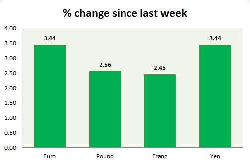 Strength meter (since last week) - Euro +3.44%, Franc +2.45%, Yen +3.44%, GBP +2.56%