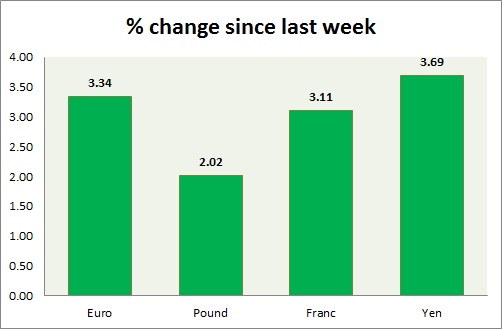Strength meter (since last week) - Euro +3.34%, Franc +3.11%, Yen +3.69%, GBP +2.02%