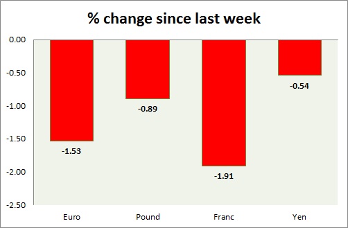 Strength meter (since last week) - Euro -1.53%, Franc -1.91%, Yen -0.54%, GBP -0.89%