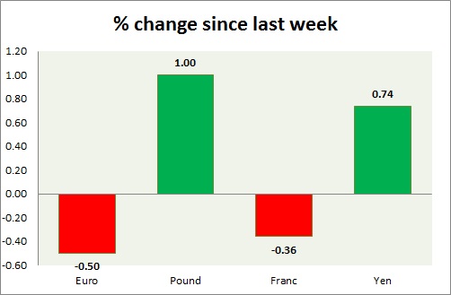 Strength meter (since last week) - Euro -0.50%, Franc -0.36%, Yen +0.74%, GBP +1%