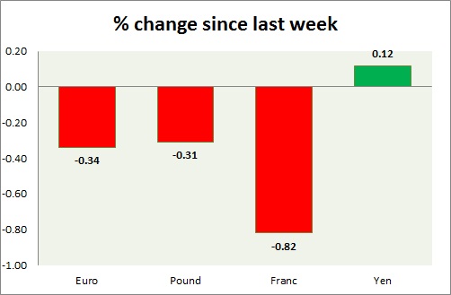 Strength meter (since last week) – Euro -0.34%, Franc -0.82%, Yen +0.12%, GBP -0.31%