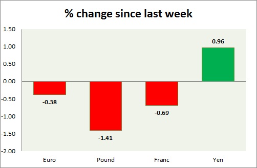 Strength meter (since last week) – Euro -0.38%, Franc -0.69%, Yen +0.96%, GBP -1.41%