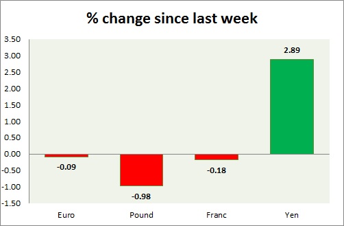 Strength meter (since last week) – Euro -0.09%, Franc -0.18%, Yen +2.89%, GBP -0.98%