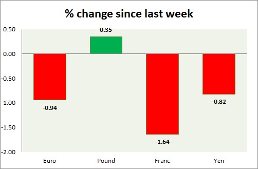 Strength meter (since last week) – Euro -0.94%, Franc -1.64%, Yen -0.82%, GBP +0.35%