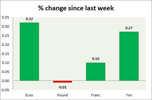 Strength meter (since last week) – Euro -0.94%, Franc -1.64%, Yen -0.82%, GBP +0.35%