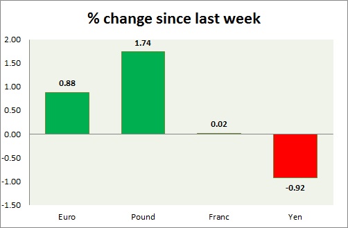 Strength meter (since last week) – Euro +0.88%, Franc +0.02%, Yen -0.92%, GBP +1.74%