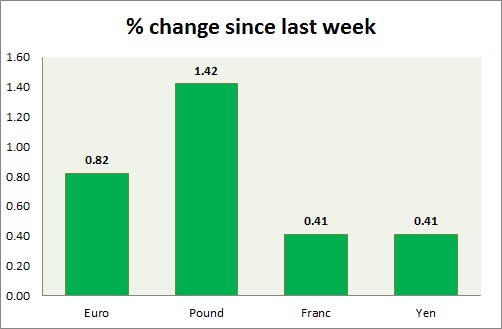 Strength meter (since last week) – Euro +0.82%, Franc +0.41%, Yen +0.41%, GBP +1.42%