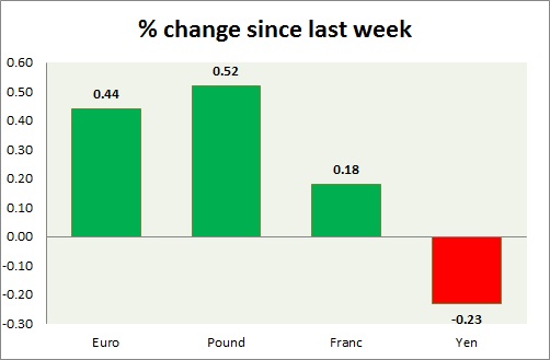 Strength meter (since last week) – Euro +0.44%, Franc +0.18%, Yen -0.23%, GBP +0.52%