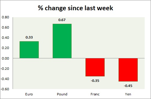 Strength meter (since last week) – Euro +0.33%, Franc -0.35%, Yen -0.45%, GBP +0.67%