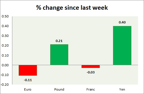 Strength meter (since last week) – Euro -0.11%, Franc -0.03%, Yen +0.40%, GBP -0.20%