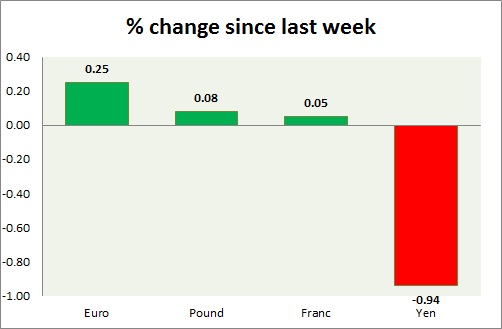 Strength meter (since last week) – Euro +0.25%, Franc +0.05%, Yen -0.94%, GBP +0.08%