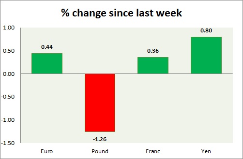 Strength meter (since last week) – Euro +0.44%, Franc +0.36%, Yen +0.80%, GBP -1.26%