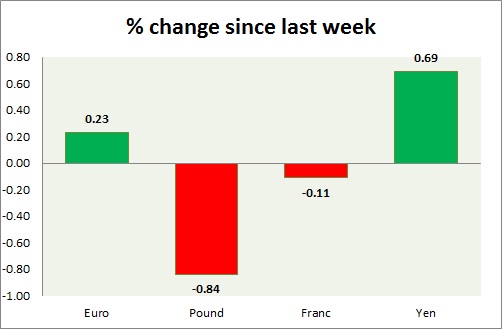 Strength meter (since last week) – Euro +0.23%, Franc -0.11%, Yen +0.69%, GBP -0.84%