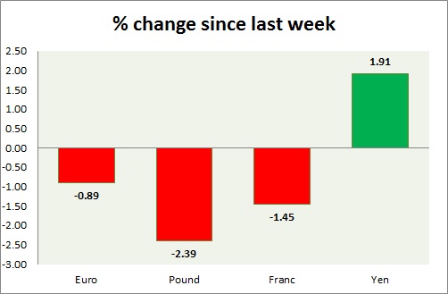 Strength meter (since last week) – Euro -0.89%, Franc -1.45%, Yen +1.91%, GBP -2.39%