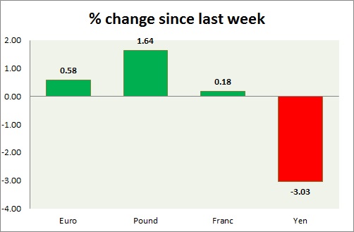 Strength meter (since last week) – Euro +0.58%, Franc +0.18%, Yen -3.03%, GBP +1.64%