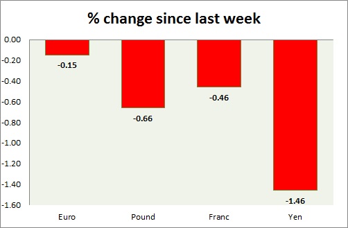 Strength meter (since last week) – Euro -0.15%, Franc -0.46%, Yen -1.46%, GBP -0.66%
