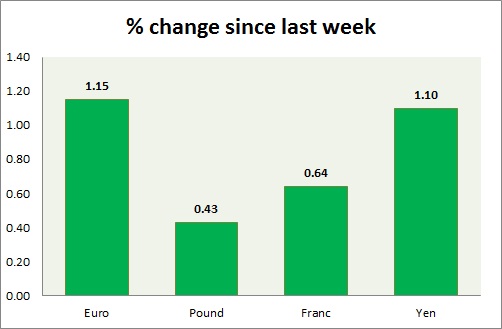 Strength meter (since last week) – Euro +1.15%, Franc +0.64%, Yen +1.10%, GBP +0.43%