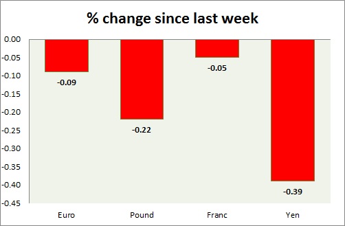 Strength meter (since last week) – Euro -0.09%, Franc -0.05%, Yen -0.39%, GBP -0.22%
