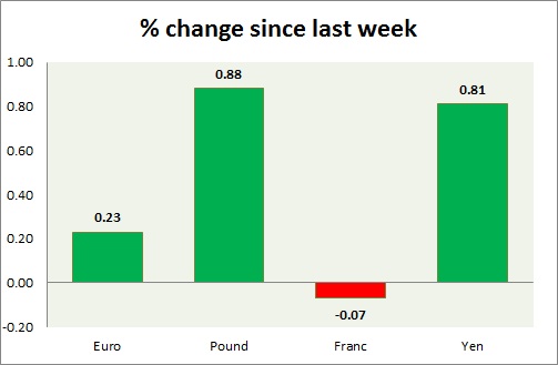 Strength meter (since last week) – Euro +0.23%, Franc -0.07%, Yen +0.81%, GBP +0.88%
