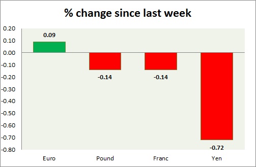 Strength meter (since last week) – Euro +0.09%, Franc -0.14%, Yen -0.72%, GBP -0.14%